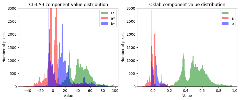 Oklab’s behavior is easy to explain: its L channel’s relative value range is big when compared to those of a and b. Based on the below histogram, I’d say Oklab’s L-vs-ab-range ratio is about 3x greater than CIELAB’s. (In sRGB, all channels span the [0..255] range, of course.)