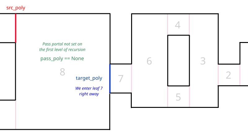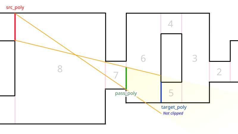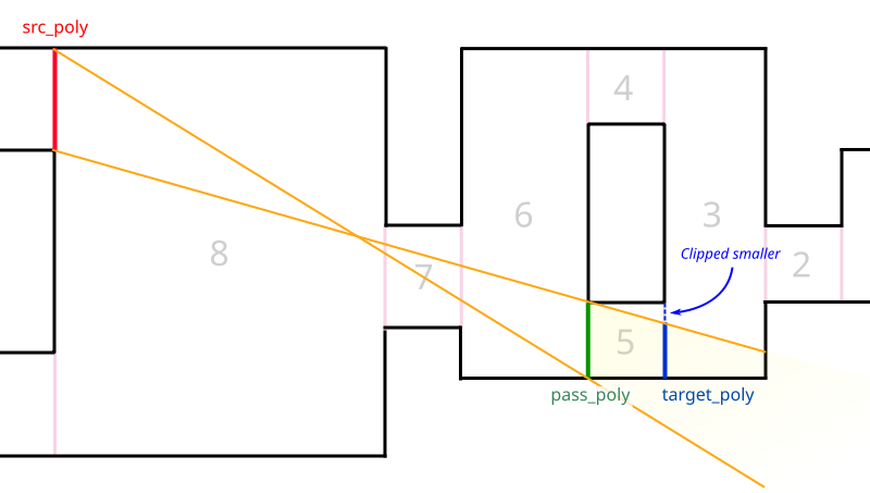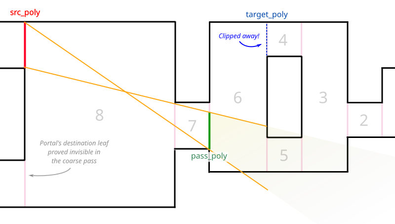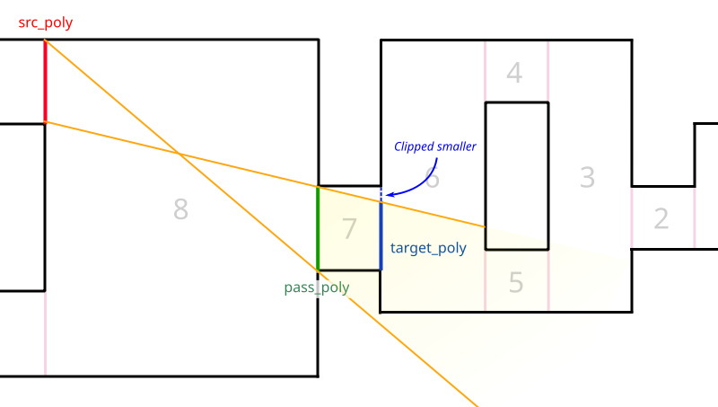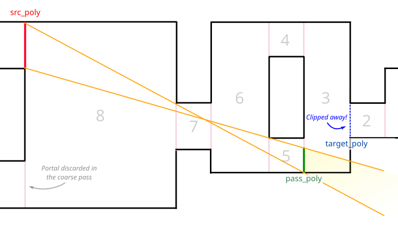 To recap what was explained previously, we have three portals: source, pass, and target. The source portal is the first one visible and where the traversal starts. The pass portal represents an opening known to visible from the source portal. The target portal is being tested for visibility through the other two portals. That’s done by clipping.