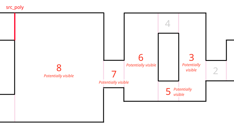 Notice how on the last step in leaf 3, we can’t enter back to leaf 5 because it’s not marked visible anymore in mightsee. The recursion may terminate based on just the array becoming so sparse that no more portals get entered. A portal getting clipped away completely is another way.